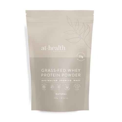 Fuel your body with At Health's new Australian Grass-Fed Whey Protein Concentrate sourced from pasture-raised cows in Victoria, Australia. This premium, single-origin whey protein delivers a complete protein profile, naturally rich in BCAAs to support lean muscle growth, muscle and tissue repair, and overall strength.