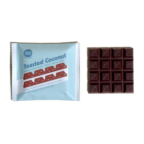 Taking you back to your childhood with crispy toasted coconut swirled through Chow Cacao's 67% Organic dark chocolate.