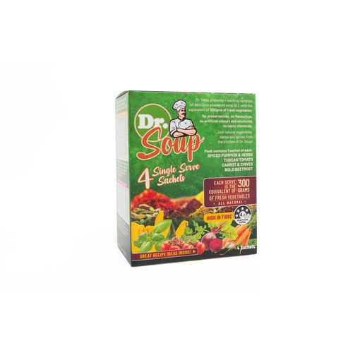 Each of the Dr. Soup® varieties is formulated from a range of dried vegetables, herbs and spices such that each 30 gram powdered serve is equivalent to 300 grams of gresh vegetables. Dr. Soup® has been designed to generously complement the diet, without completely replacing fresh vegetables.