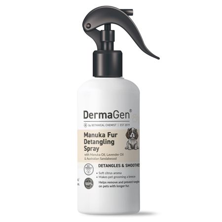 This Manuka Fur Detangler will help prevent knots and tangles in your furry friend's hair. It also has a unique blend of natural essential oils to help calm your pet while being gentle on their skin.