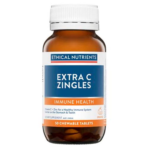 Ethical Nutrients Extra C Zingles has been meticulously crafted with low acidity vitamin C - gentle on the stomach & teeth and high strength, easily absorbed zinc (Meta Zn ) in a zingy orange-flavoured chewable tablet.