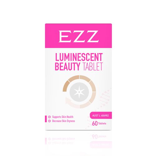 The EZZ Luminescent Beauty Tablet targets skin repair and collagen formation. The formulation of Lycopersicon esculentum and glutathione repair cell damage, while Rosa canina(rosehip) extract work to support overall skin integrity.