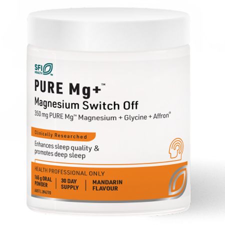 PURE Mg+ Magnesium Switch Off by SFI Health is a clinically researched formula to support healthy muscle relaxation and promote deep, restful sleep. It contains a therapeutic dose of PURE Mg magnesium to relieve muscle cramps and mild muscle twitches and spasms when dietary intake is inadequate.