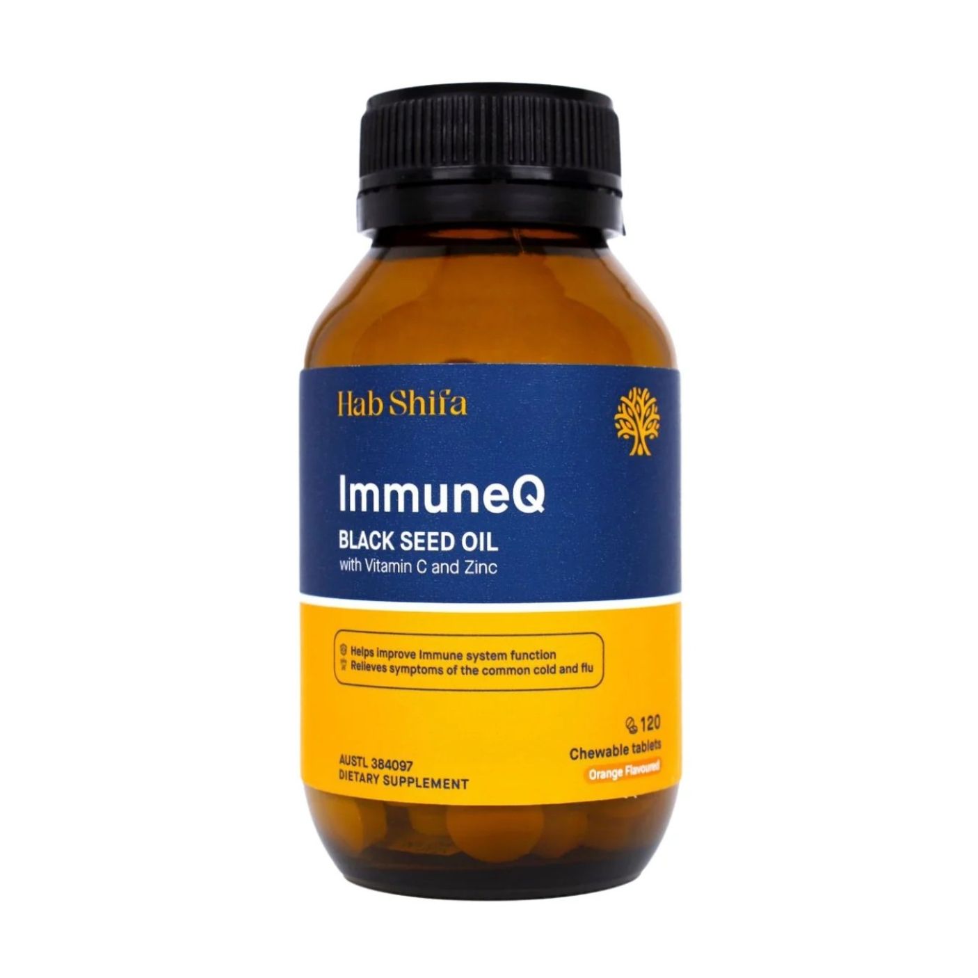 Hab Shifa ImmuneQ is a unique formulation of therapeutically active ingredients; Black Seed oil (Nigella Sativa oil), Zinc and Vitamin C, designed to support healthy immune system function and relieve symptoms of the common cold and flu.