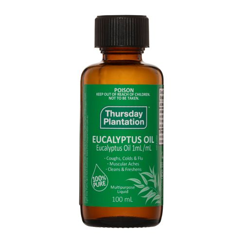 Thursday Plantationˢs Eucalyptus Oil, contains 100% pure Eucalyptus Globulus oil with a high percentage of the Eucalyptol compound which is responsible for the oilˢs clean, sharp, slightly medicinal smell as well as its medicinal value.