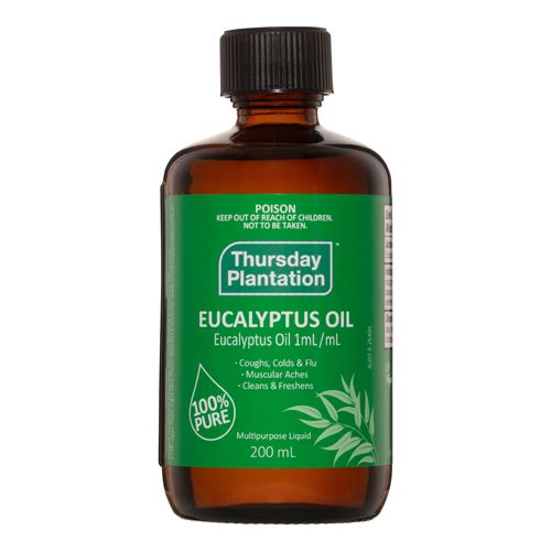 Thursday Plantationâs Eucalyptus Oil, contains 100% pure Eucalyptus Globulus oil with a high percentage of the Eucalyptol compound which is responsible for the oilâs clean, sharp, slightly medicinal smell as well as its medicinal value.