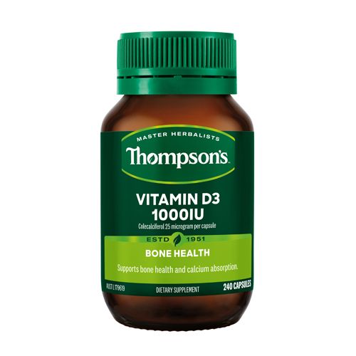 Thompsons Vitamin D3 1000IU assists with calcium absorption. A diet deficient in calcium can lead to osteoporosis later in life. It can be used to: