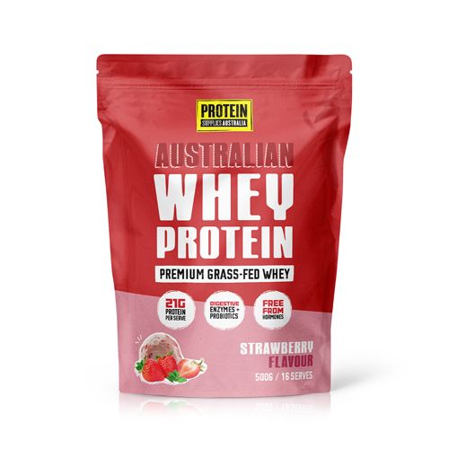 Power up your day with Protein Supplies Australia's Australian Whey Protein Strawberry, made from premium grass-fed Whey Protein right here in Australia. Each serve delivers 21g of clean protein with a smooth strawberry flavour, naturally sweetened with Stevia.