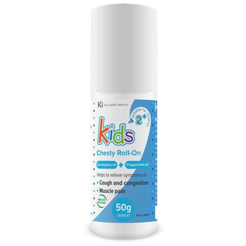 Always read the label. Follow directions for use. If symptoms or coughing persist, talk to your health professional. Not to be used in children under two years of age without medical advice. For external use only. Ki Kids Chesty Roll-on is a gentle formula and is unlikely to irritate, however as with all skin products, it is always recommended to test a small patch on skin as a precaution.