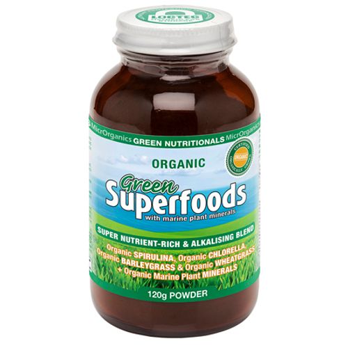 A unique blend of the World s 5 most nutrient-rich superfoods, GreenSUPERFOODS contains a natural super-rich spectrum of wholefood nutrients including powerful plant pigments and carotenoids, plant enzymes, complete plant protein, organic vitamins, minerals and trace elements, all in one exceptional product. This high potency green powder supplement delivers a load of positive health and vitality benefits in one convenient blend.