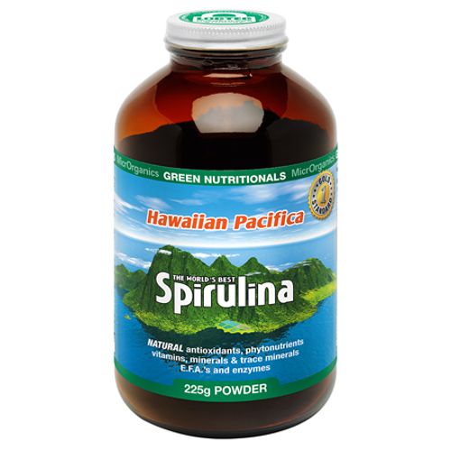 Hawaiian Pacifica Spirulina contains around sixty percent complete, highly digestible protein and contains every essential amino acid. It also contains more beta-carotene than any other whole food. It is the best whole food source of gamma linolenic acid (GLA). It is rich in B vitamins, minerals, trace elements, chlorophyll, and enzymes.