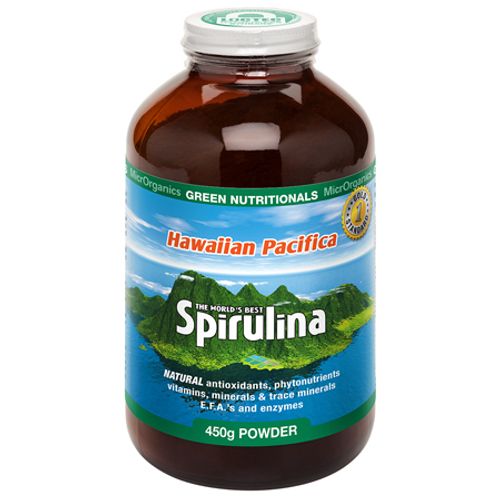 Hawaiian Pacifica Spirulina contains around sixty percent complete, highly digestible protein and contains every essential amino acid. It also contains more beta-carotene than any other whole food. It is the best whole food source of gamma linolenic acid (GLA). It is rich in B vitamins, minerals, trace elements, chlorophyll, and enzymes.