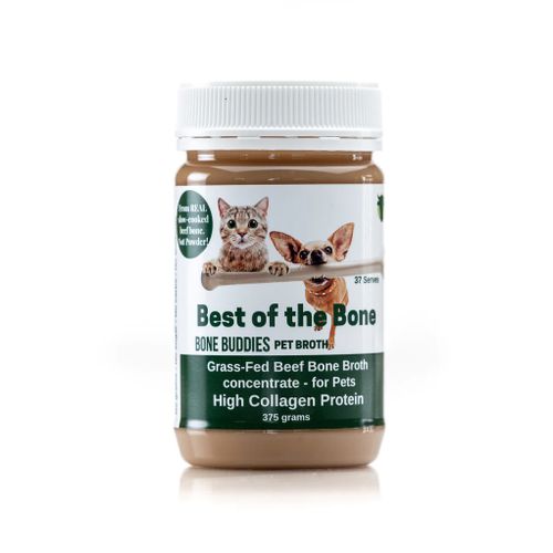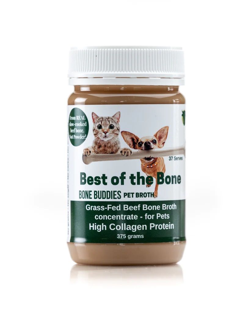 A REAL PET SUPERFOOD without the grains, sugars, and additives that destroy our beloved pet's digestive health. Pure, real, thick and collagen-rich bone broth concentrate slow-cooked from grass-fed and finished bones. Loved by dogs and cats alike. And why not, Best of the Bone's "Bone Buddies" natural flavour is loaded with the nutrients that are the building blocks of their health - complete amino acids, collagen protein (the key protein for their bone, joint, skin and fur!) and those healthy, critical fats that mimic the fats in their brain and are a key source of energy for any animal. Nearly 40% bio-available collagen and loaded with:
