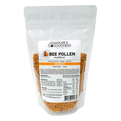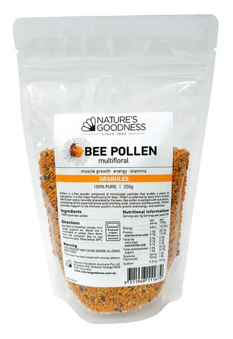 Pollen is a fine powder composed of microscopic particles that enable a plant to reproduce. It is the major food source for bees. Pollen is collected by bees from within the flower and is naturally granulated by the bees. Bee pollen is packed with nutrients, containing all the essential amino acids and fatty acids, vitamins and flavonoids. Pollen provides support to the immune system, muscle growth and energy, and stamina.