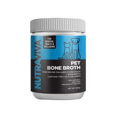 Nutraviva Pet Bone Broth has been designed to be incorporated into your pet's diet on a daily basis to support the general health and wellness of your pet as well as both a preventative and supportive strategy to reduce the impact of age related joint and bone deterioration.