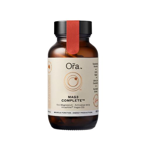 Ora Mag3 Complete contains a unique blend of three readily-absorbed forms of magnesium: Magnesium amino acid chelate, Magnesium citrate anhydrous and Magnesium glycinate dihydrate for optimal absorption to help support muscle, nervous system, bone and heart health. Combined with Vitashine™, a vegan Vitamin D3 sourced from lichen for immune support and Vitamin B12 to support energy production.