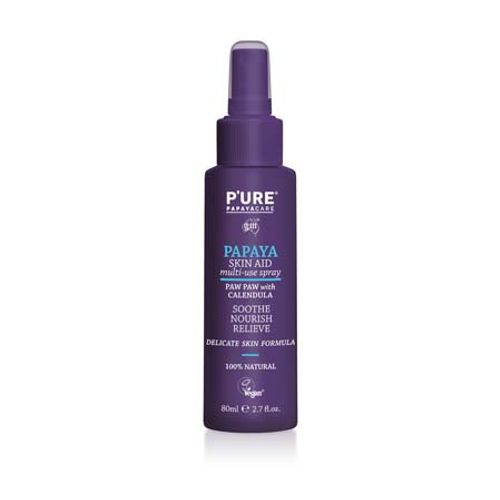 P'ure Papayacare's Skin Aid is a gentle, alcohol-free mist formulated with a nourishing blend of Papaya, Licorice Root and Calendula to soothe and nourish dry, irritated skin.