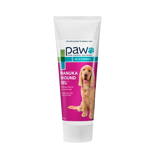 PAW Manuka Wound Gel is a sterile medical grade wound dressing made from Leptospermum.sp (Manuka) honey (80%) and natural oils and waxes for wound management. It is ideal for dogs, cats, horses and other companion animals with wounds, burns, grazes and as a general first aid.