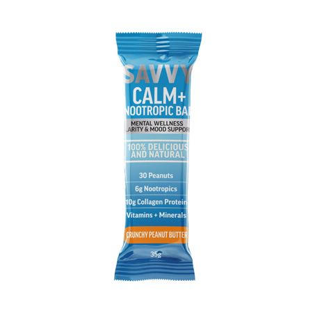 CALM+ Nootropic Bars are made with real foods, like organic peanuts, peanut butter, collagen, pea fibre, vitamins, minerals and nootropics to help with keeping you calm and mentally clear.
