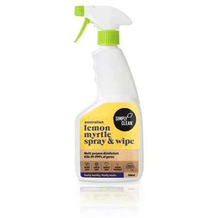 Lemon Myrtle Spray & Wipe is a toxin & sensitiser free multipurpose disinfectant cleaner that tackles grime, dust & grease and kills household germs in the kitchen, bathroom and around your home, leaving the fresh fragrance of pure Australian lemon myrtle.