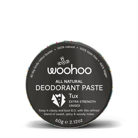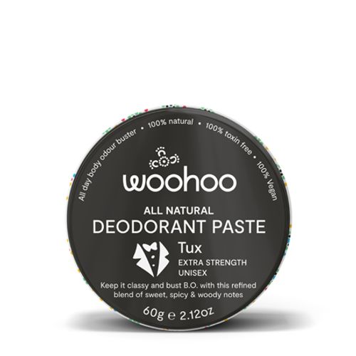 The 100% natural, 100% effective Woohoo Tux Deodorant Paste is all class. This extra strength all natural deodorant paste will banish body odour in style, keeping you fresh all day and into the night. The bergamot and patchouli scent is a top-shelf blend of sweet, spicy and woody notes. Just scoop a small amount, melt it between your fingers, and rub it in like moisturiser for 24 hour protection from body odour.