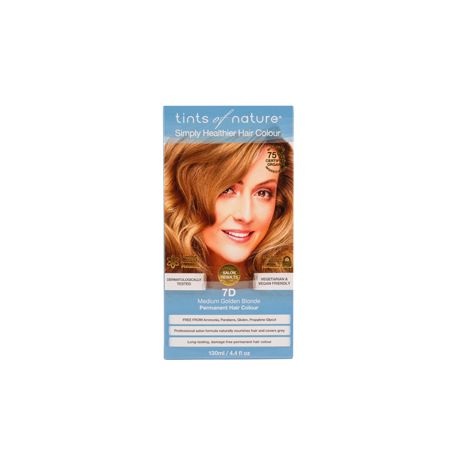 Rediscover happier, healthier hair with Tints of Nature 7D Medium Golden Blonde patented permanent hair dye for a classic golden blonde full of depth and high shine.