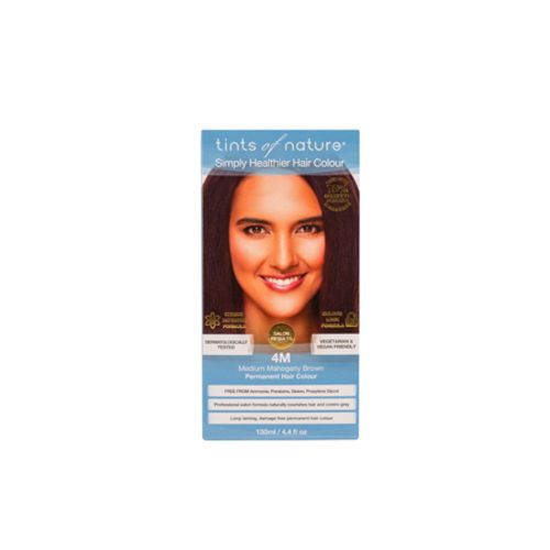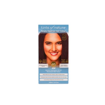 Rediscover happier, healthier hair with Tints of Nature 4M Medium Mahogany Brown patented permanent hair dye for a natural, red twist on the classic brunette with subtle violet undertones.