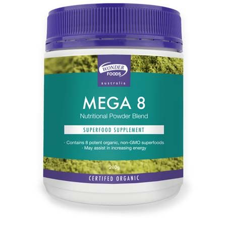 Wonderfoods Mega 8 is a power packed energy formula, consisting of 8 certified organic superfoods, to help give you the boost that you need! Mega 8 powder is packed with 8 non-GMO, certified organic superfoods, that provides an all-natural, nutrient dense boost. This formula contains a range of superfoods including, raw cacao, goji berry, spirulina, green barley grass, acai berry, moringa leaf, camu camu and chlorella. These provide antioxidants, carotenoids, polyphenols, amino acids, vitamins, minerals, soluble and insoluble fibre.