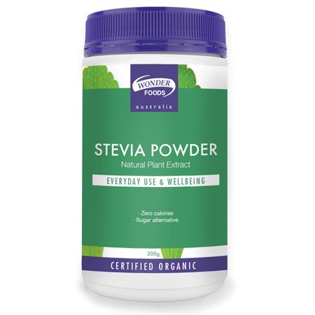 If you have a sweet-tooth and are passionate about your health, add this organic Stevia powder for a low-calorie natural sweetener. Wonderfoods stevia is a water based extract from organic stevia and is a natural alternative to sugar, is chemical free with no added nasties! Stevia (Steviol Glycosides) is derived from the leaves of the stevia Rebaudiana plant, making this all natural supplement a great healthy choice. It is naturally very sweet and considered 100 to 300 times sweeter than sugar, contains not calories and does not produce a glycaemic response like sugar does, making it an excellent choice for those limiting their sugar intake.